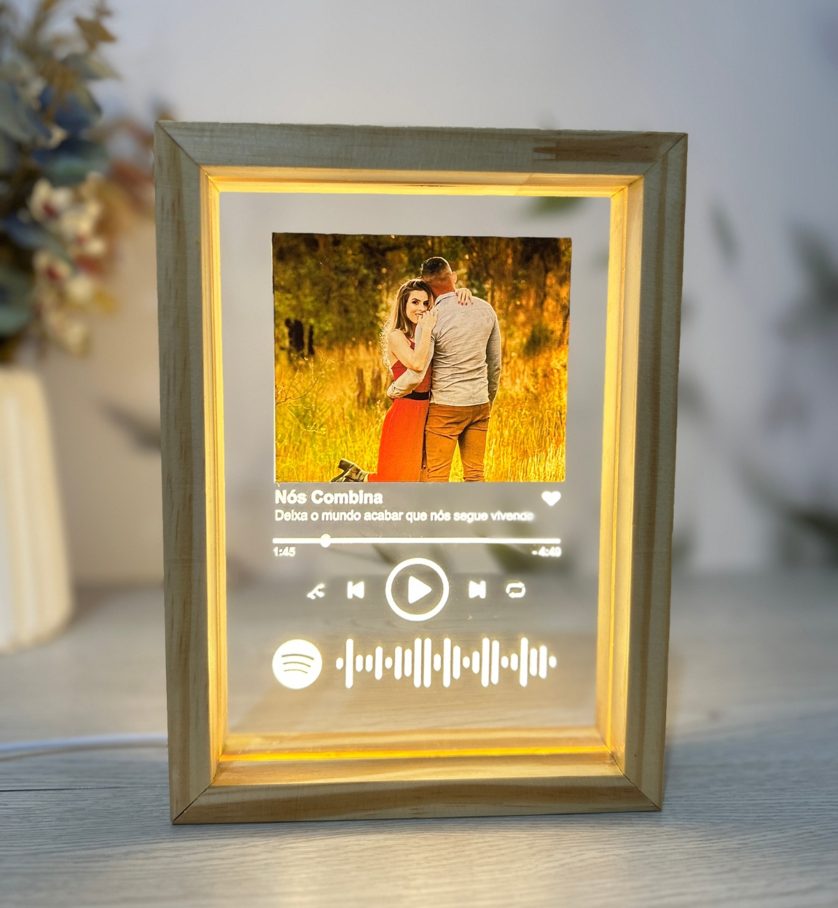 O produto consiste em uma base LED (feita em madeira nobre muiracatiara tratada com verniz incolor ) + um acrílico de 5mm, que encaixa neste suporte e pode ser personalizado com a sua foto, frase, música e também tem a opção de gravar uma escrita na base de madeira.