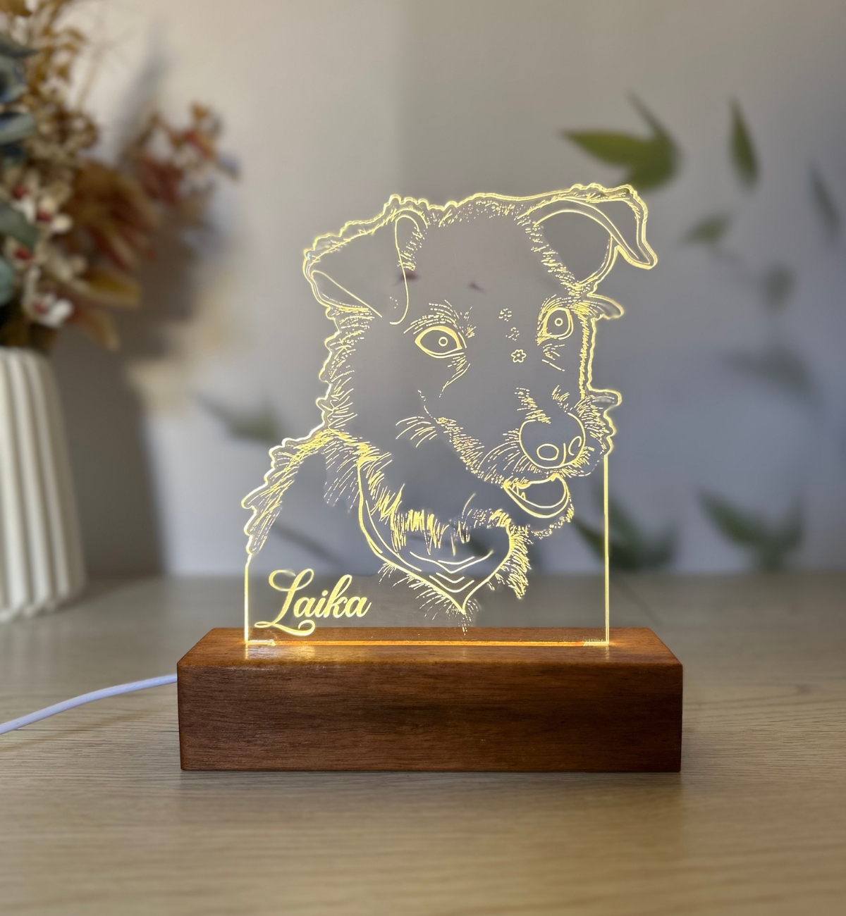 Nosso produto consiste em uma base LED (feita em madeira nobre muiracatiara tratada com verniz incolor ) + um acrílico de 5mm, que encaixa neste suporte e pode ser personalizado.