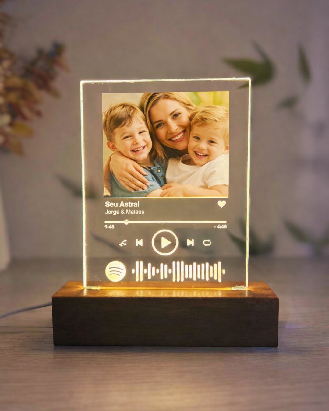 O produto consiste em uma base LED (feita em madeira nobre muiracatiara tratada com verniz incolor ) + um acrílico de 5mm, que encaixa neste suporte e pode ser personalizado com a sua foto, frase, música e também tem a opção de gravar uma escrita na base de madeira.